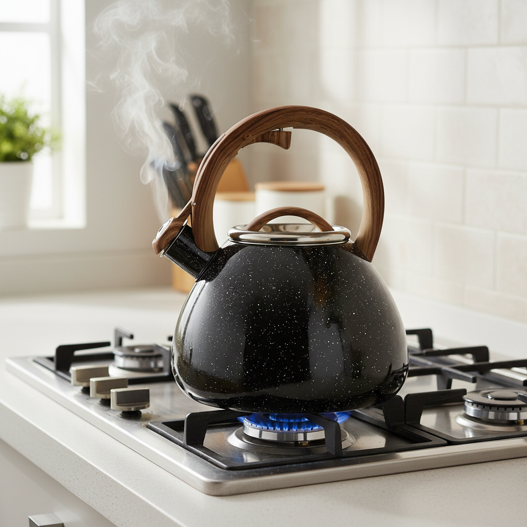 Wil je een fluitketel inductie kookplaat die praktisch is én een warme uitstraling heeft? De Altom Design Andy fluitketel 2,3 liter in zwart met bruine houtlook combineert nostalgisch gebruiksgemak met een modern design. Dankzij het koelblijvende soft-touch handvat, de klassieke fluit en het handige hefmechanisme kook je veilig water voor thee, koffie, soep, bouillon of pasta. Geschikt voor inductie, gas en alle warmtebronnen, zodat je altijd flexibel bent.