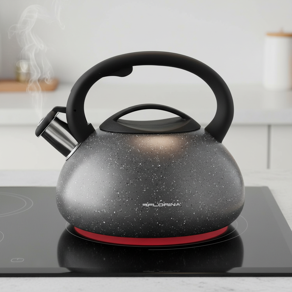 Wil je een fluitketel inductie kookplaat die echt opvalt in je keuken? De Florina Lava fluitketel 2,5 liter in zwart/grijs met steenlook coating combineert een nostalgische fluit met een modern en robuust design. Dankzij het koelblijvende soft-touch handvat, de krasbestendige coating en het handige hefmechanisme voor de fluitdop kook je water voor thee, koffie, soep, bouillon of pasta veilig en comfortabel. Geschikt voor inductie, gas en alle warmtebronnen.