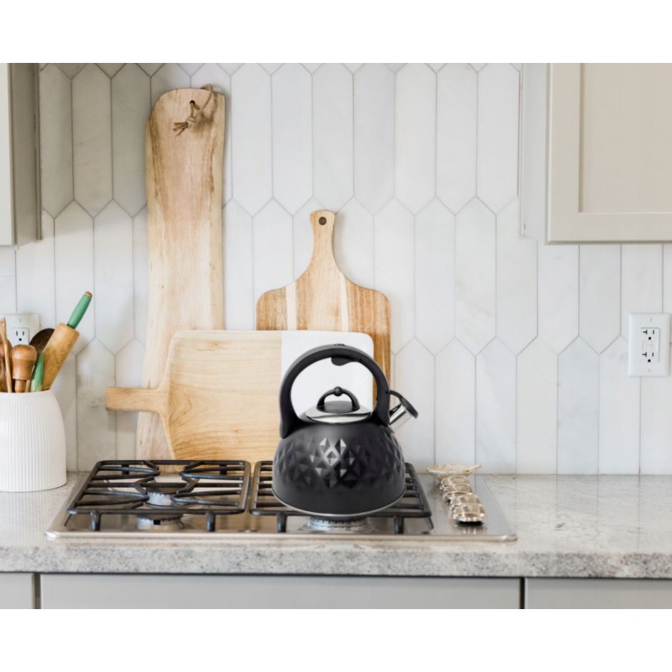 Het matzwarte oppervlak met 3D ruitvormig reliëf geeft de fluitketel een luxe en moderne uitstraling. -