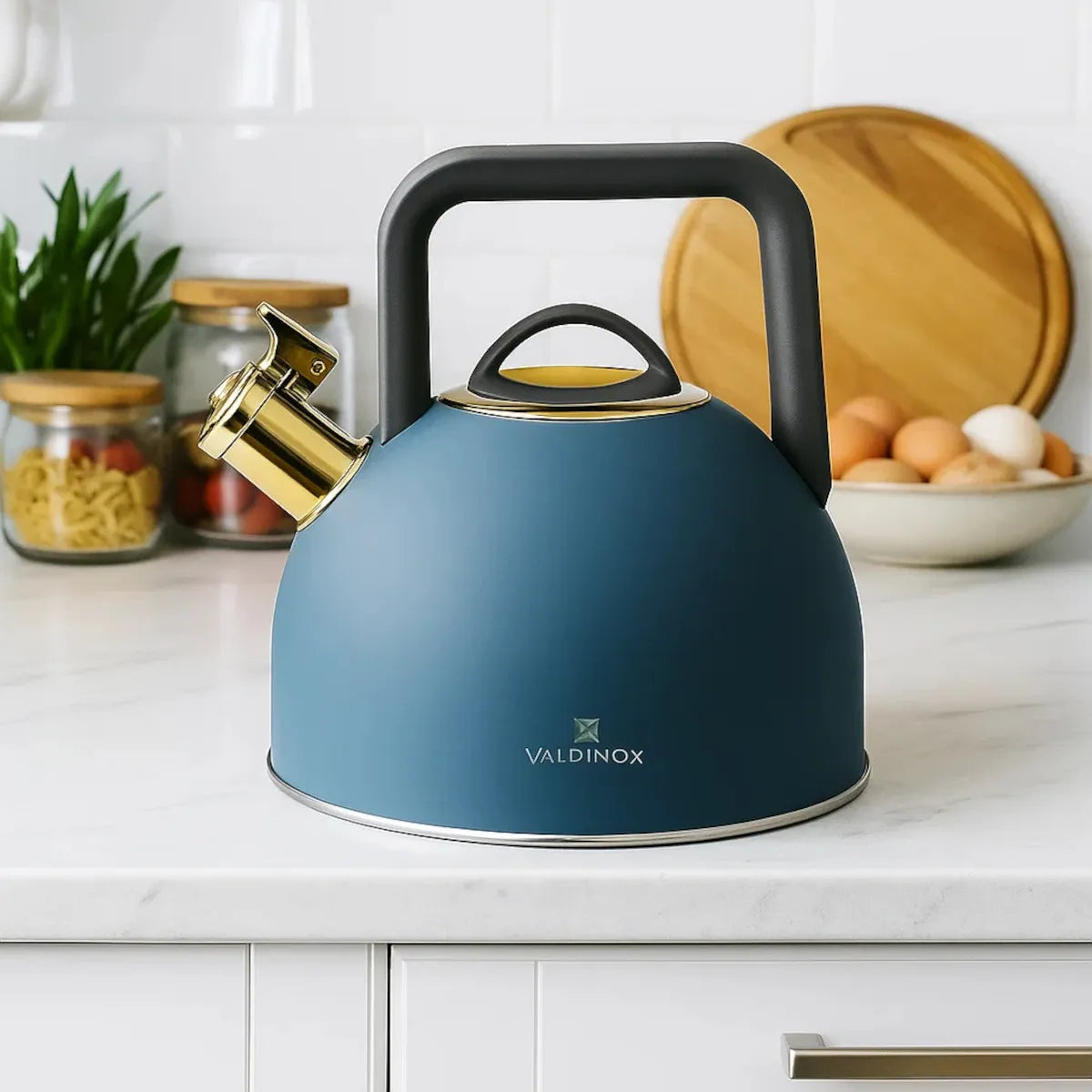 De Valdinox Giovanni fluitketel 2,5 liter is ontworpen voor keukens waar stijl, functionaliteit en kwaliteit samenkomen. Deze RVS inductie fluitketel valt direct op door zijn matblauwe afwerking gecombineerd met verfijnde gouden accenten, wat zorgt voor een luxe en moderne uitstraling. Ideaal voor dagelijks gebruik en perfect afgestemd op wie koken ziet als een moment van rust en beleving.